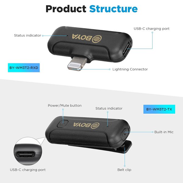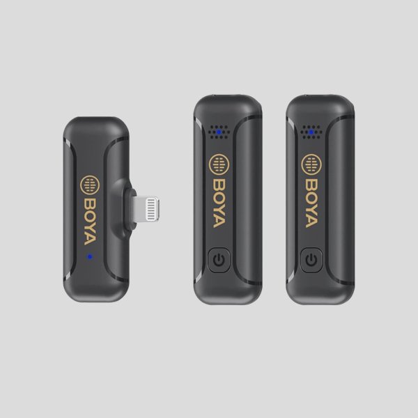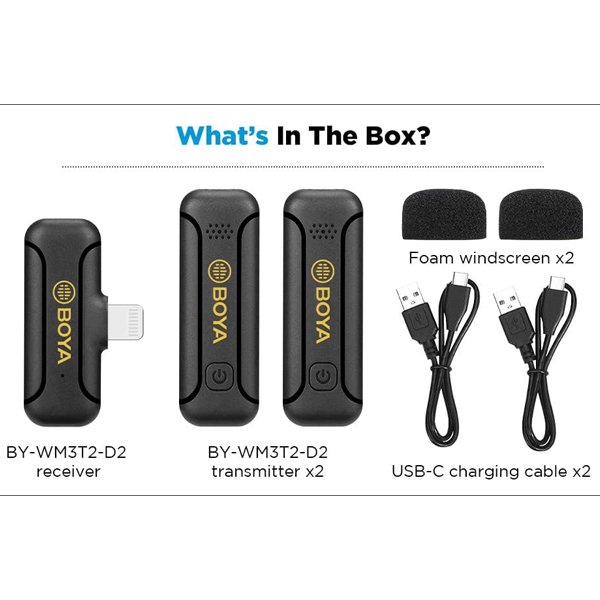 The BY-WM3T2 D2 is a mini 2.4GHz wireless microphone system designed for Apple iOS devices. It’s perfect for live streaming, vlogging, and course recording. The system includes 2 transmitters and 1 receiver. The transmitter has a built-in rechargeable battery that lasts up to 10 hours and can be charged via a Type-C port. The receiver is powered by your phone and even allows you to charge your phone while in use. The system can deliver clear sound up to 50m away and has a noise reduction function.